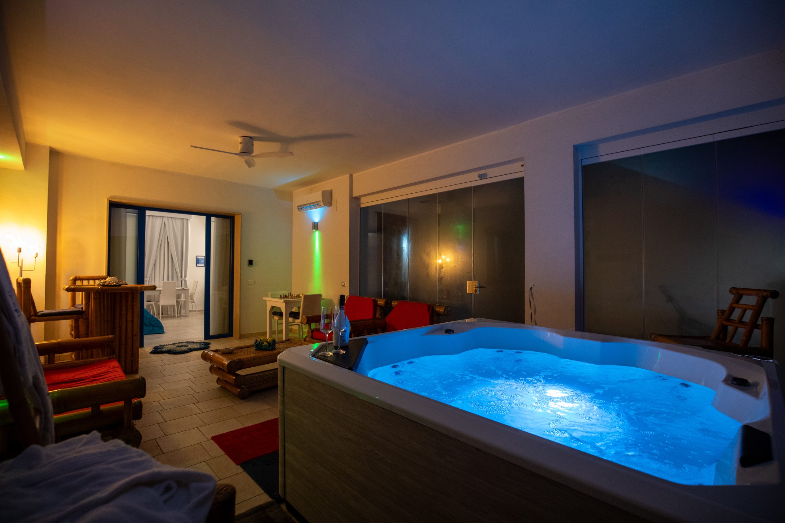Inoltre, la spa è dotata di una smart TV da 50", un tavolo da scacchi per un po' di svago mentale e un comodo salotto in bamboo tailandese, perfetto per un momento di puro relax.