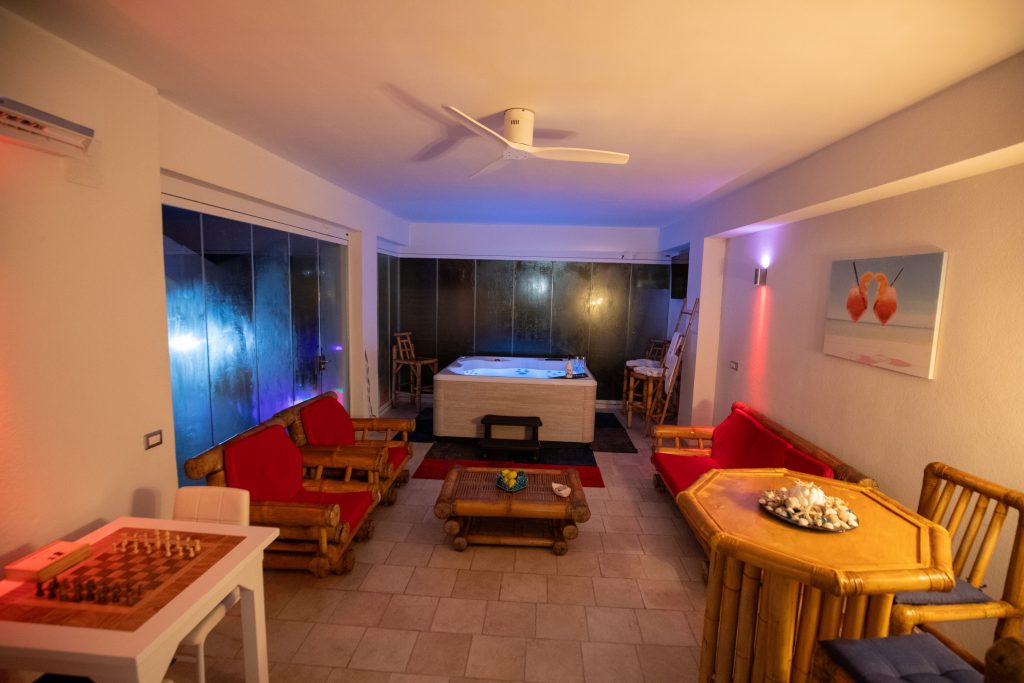 La Sala Relax è di circa 50 mq, possiede all’interno tavolo e salotti in bamboo thailandesi, un tavolo scacchiera e tutto il necessario per il Coffee and Tea Time. La suddetta vasca idromassaggio, dotata di Whirlpool Jets ad intensità di flusso regolabile, tecnologie Chromolight e sistema di purificazione a raggi UV integrati, è sormontata da una smart tv 50 samsung di ultima generazione.